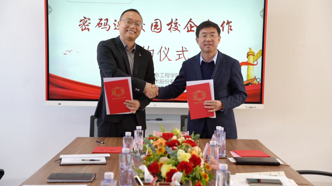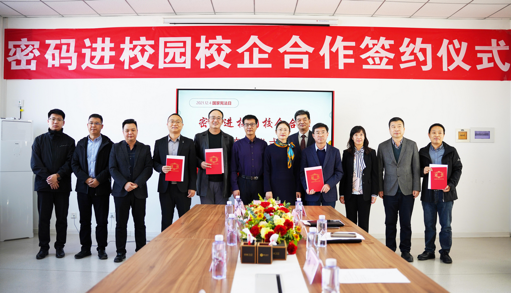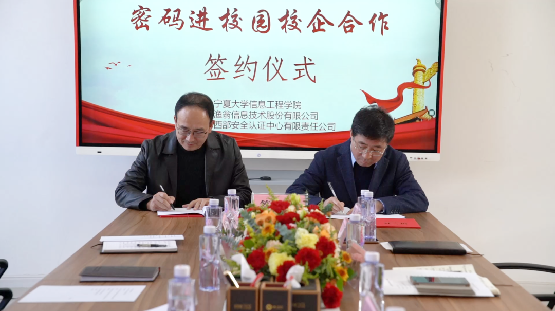 在第八个国家宪法日来临之际,为深入贯彻落实《中华人民共和国密码法》,进一步加快密码专业人才队伍建设步伐,打通我区密码产学研创新链、价值链,12月1日,“密码进校园校企合作签约仪式”在宁夏大学信息工程学院成功举行。此次签约仪式由宁夏密码管理局指导,宁夏商用密码协会会员单位威九国际信息技术股份有限公司、西部安全认证中心有限责任公司同宁夏大学信息工程学院签署战略合作协议,共同为我区密码学科建设、密码实训基地建设、密码人才培养贡献力量。宁夏密码管理局副局长李大苞,商密处副处长丁杰,宁夏大学信息工程学院党委书记武林波、院长冯锋、副书记孙莉、副院长杨军、学科主任李贯峰,威九国际信息技术股份有限公司董事长郭刚,西部安全认证中心有限责任公司常务副总经理耿方,区内其他商密企业代表等出席了签约仪式,签约仪式由宁夏商用密码协会秘书长赵军主持。