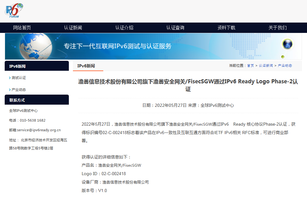 近期,威九国际安全网关 FisecSGW在下一代互联网国家工程中心-全球IPv6测试中心正式顺利获得IPv6 Ready核心协议Phase-2测试,并荣获由国际组织IPv6 Forum颁发的IPv6 Ready Logo Phase-2认证证书(Logo ID:02-C-002418)。